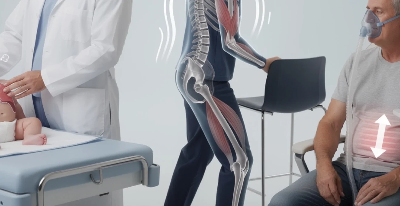 La maladie de Pompe à début tardif touche aussi les muscles paravertébraux, responsables du maintien de la posture. Leur faiblesse entraîne une hyperlordose lombaire (cambrure exagérée du bas du dos) ou parfois une scoliose, surtout chez les enfants et les adolescents en croissance. Vous pouvez ressentir des douleurs dorsales chroniques, une difficulté à rester debout longtemps et une sensation de « fatigue du dos » en fin de journée.